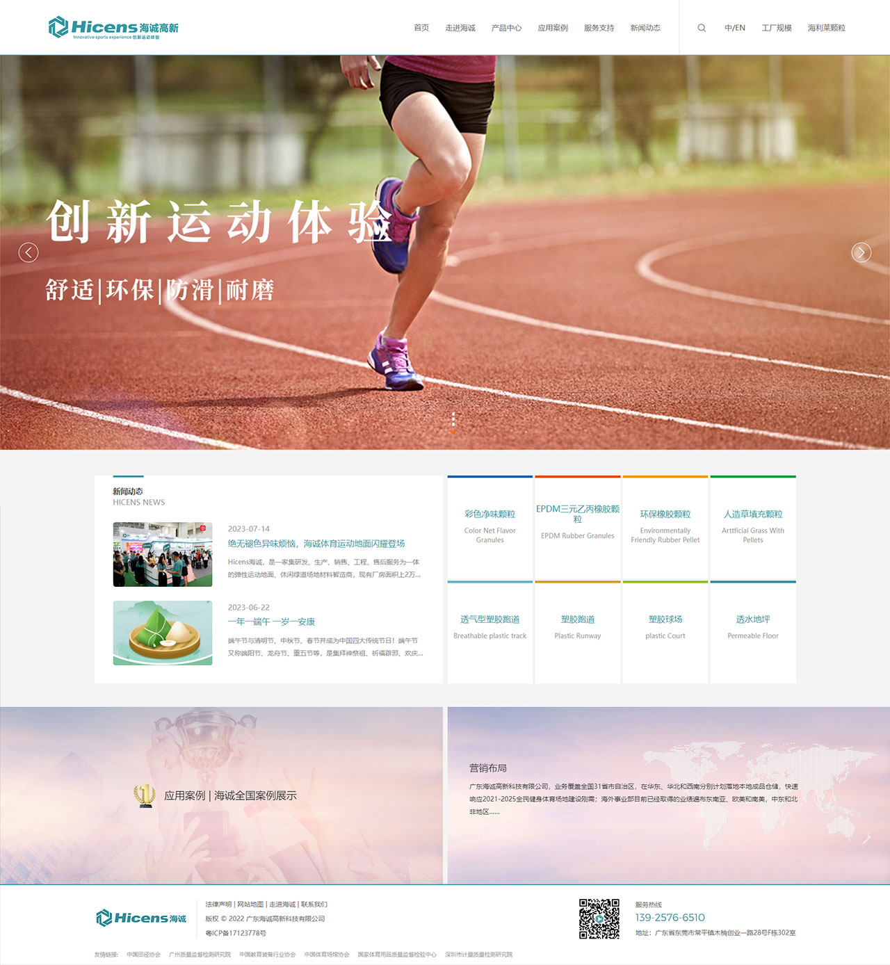 Hicens海誠,是一家集研發、生產、銷售、工程、售后服務為一體的彈性運動地面、休閑綠道場地材料智造商,現有廠房面積上2萬平方米,通過ISO9001質量管理體系、ISO14001環境管理體系、ISO45001職業健康安全管理體系認證,日產量300噸,年產能10萬噸。主要產品海利萊彩色凈味顆粒、EPDM顆粒、環保橡膠顆粒、TPE塑膠跑道、塑膠球場、透水地坪綠道系列產品,均采用環保新材料及工藝,符合新國標GB36246-2018和GB/T14833-2020國家新標準。